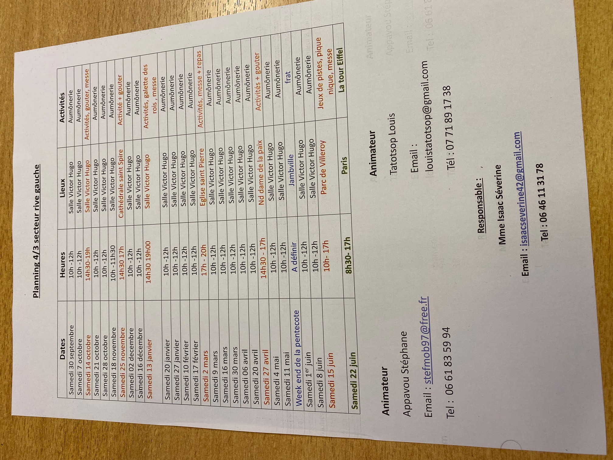 Infos planning aumônerie 4/3 Animateurs :APPAVOU Stéphane 06 61 83 59 94 planning à venirrecontrele samedi 27 janvier 2024 à 10 h Salle Victor Hugo Vues : 1486