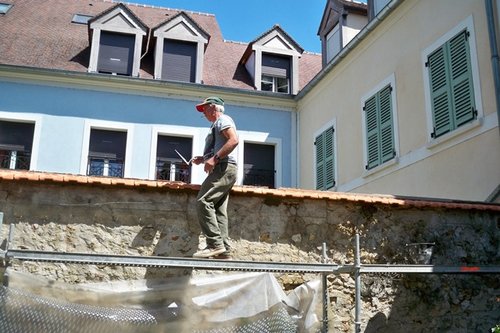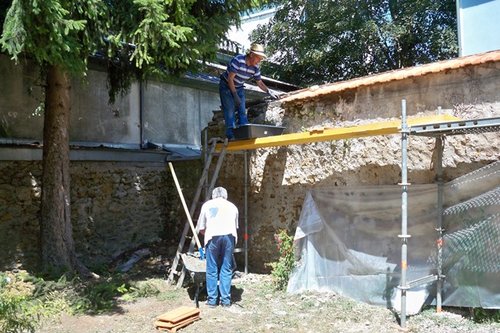 Notre presbytère dispose d’un joli jardin, bordé d’un côté par un mur en pierres meulières, couvert de tuiles. Au fil des années, l’état de ces tuiles s’est détérioré et leur remplacement devenait urgent, l’eau de pluie s’infiltrant dangereusement dans le mur à chaque averse...
